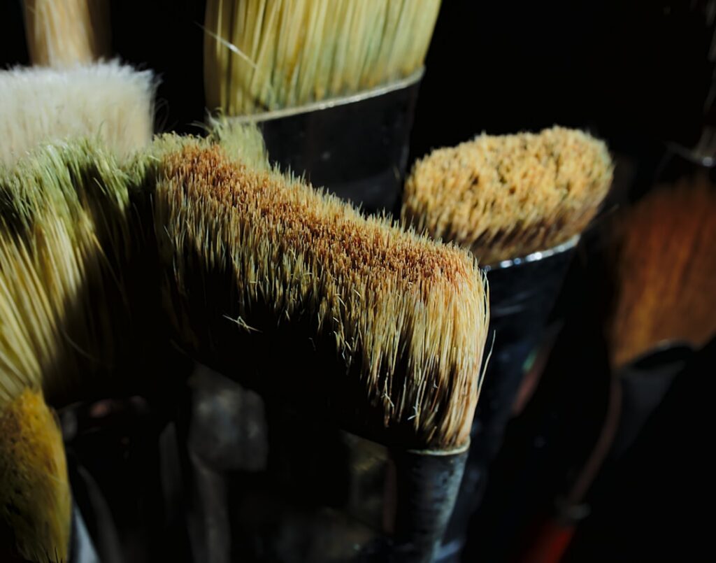 Tintas acrílicas, óleo, aguarela, guache, pincéis, paletas, telas e cavaletes.